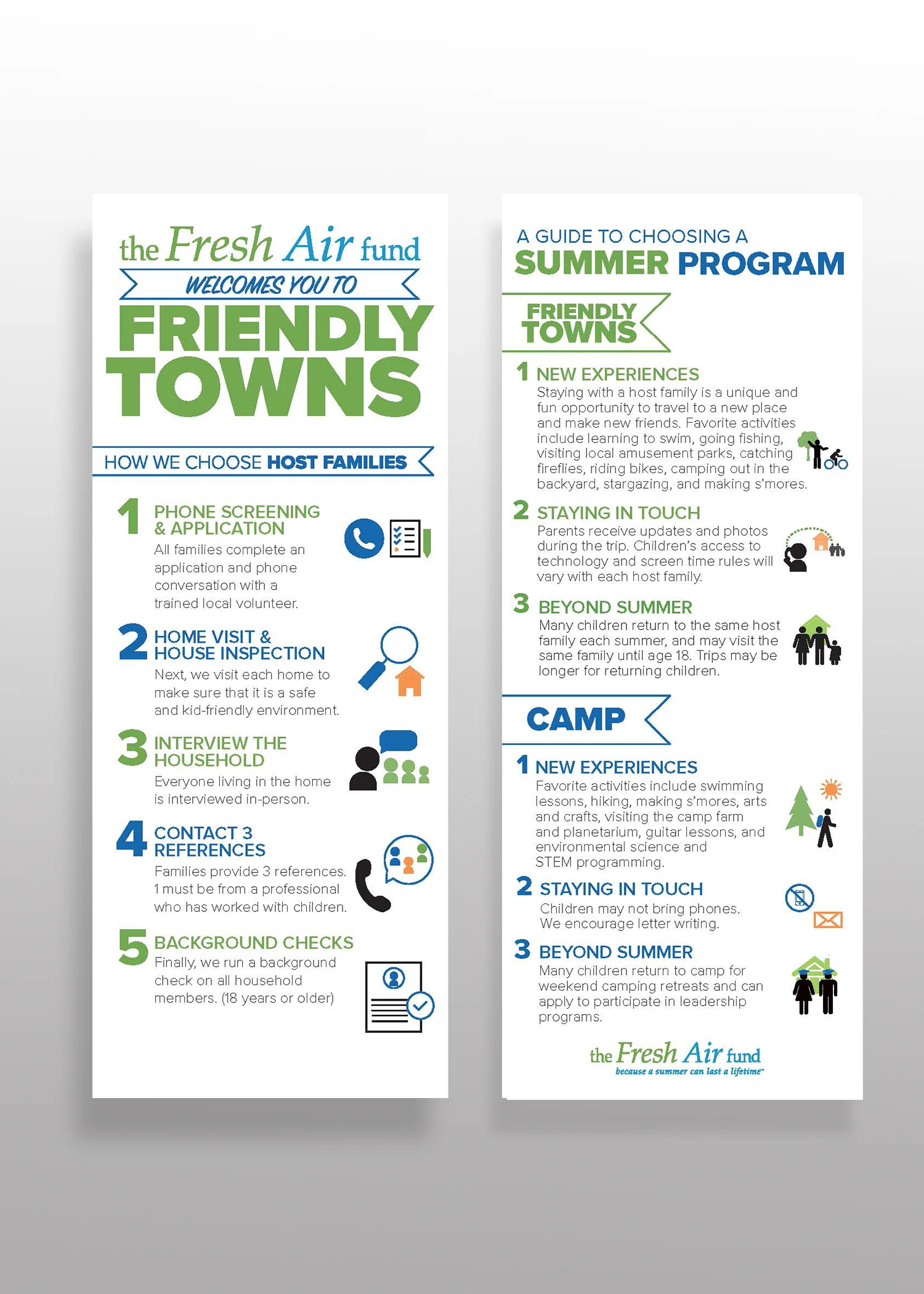 The concept of Friendly Towns where children go to a volunteer host family for 1 to 6 weeks in a different state is still a new idea to many even though this was The Fresh Air Fund’s 1st program. My mission was to design a succinct infographic that explains our Friendly Towns & Camp programs and how we choose hosts. This document needed to be simple because many of the children we serve tend to be the translator for their immigrant parents. This infographic would be placed in one of our Child Recruitment Brochures given to prospective participants and their families.