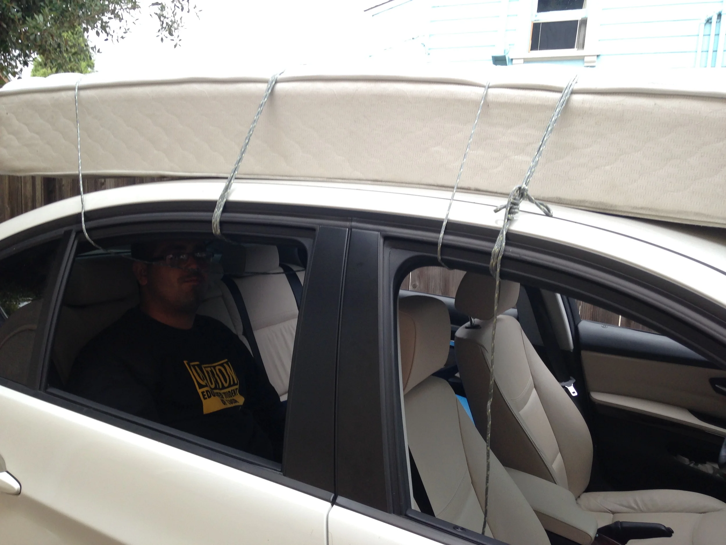 i learned how to tie down a mattress to a car. When tying down a mattress, remember to open the doors first before tying down the mattress or else you have to jump in the window in order to drive the car.