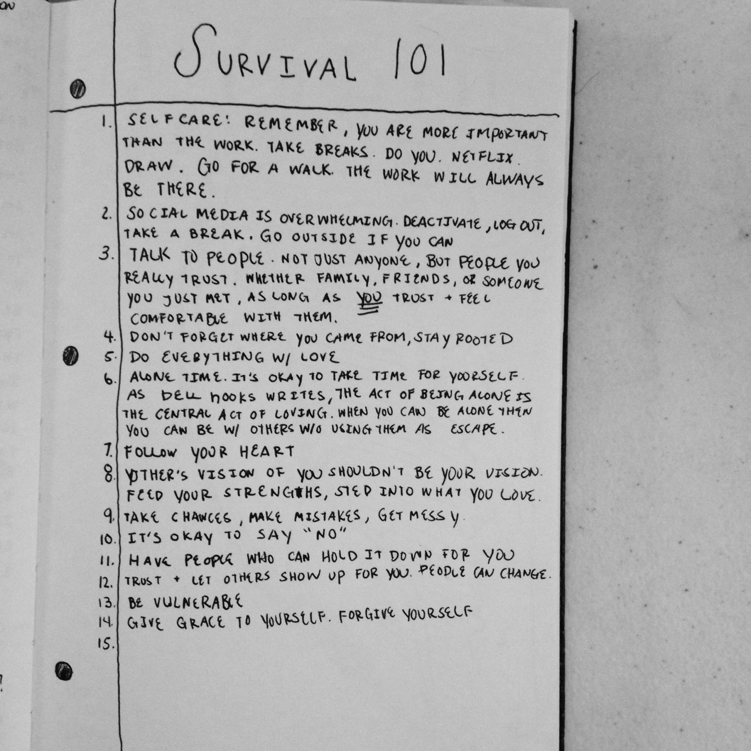 one of the ideas that came to mind when i started this project was a resource guide that student organizers could consult when they needed to take time to heal themselves because social justice is very draining and taking care of oneself isn't really emphasized or taught. it's just work, work ,work.